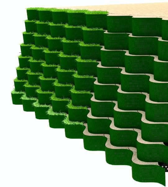 StrataWeb® fascia system’s biggest advantages are that it comes in a collapsible form (easy transportation) and the installation can be carried out by unskilled labour. Not to forget the aesthetics, the outermost strap of the StrataWeb® panels used as fascia can be made in green colour to match with the lush greenery around.
